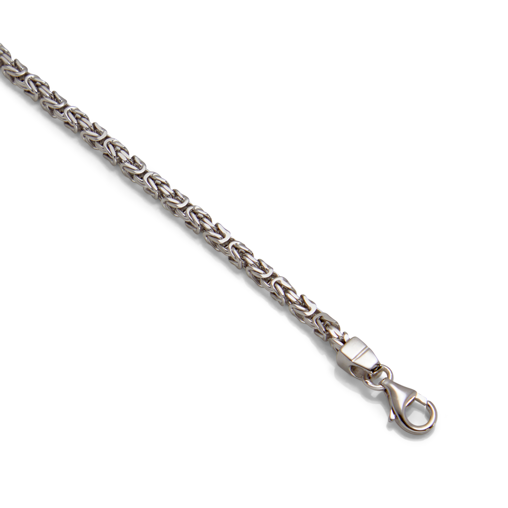 The beautifully detailed Saturno Byzantine chain is made in sterling silver and is available in a 19cm length. The bracelet is hallmarked in the UK and is rhodium plated to prevent tarnishing.