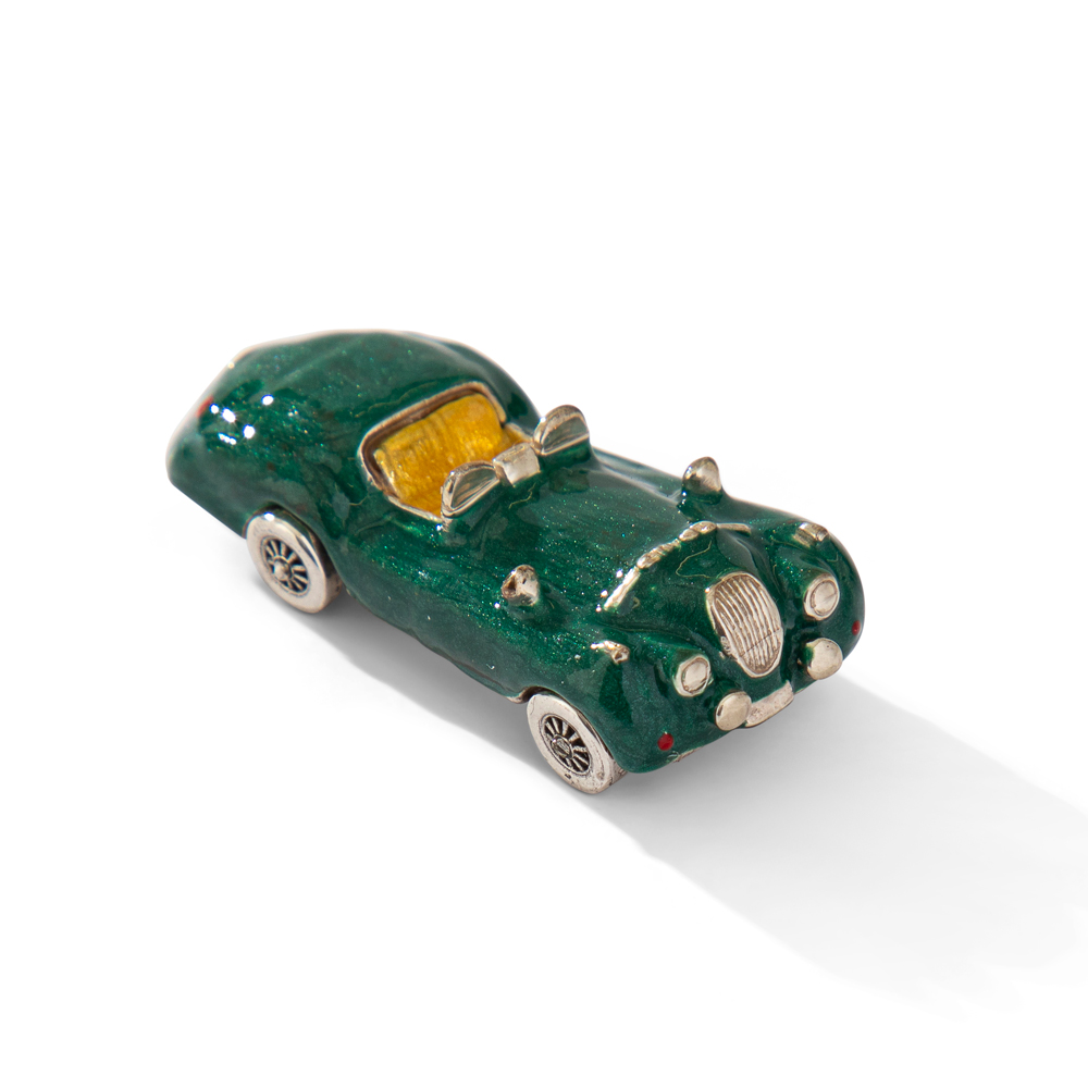 Celebrate classic automotive elegance with this exquisite reproduction of the iconic Jaguar XK120. Handcrafted in Italy by renowned artisans at Saturno, this high-quality ornament is cast in fine sterling silver and hand-painted with rich enamel detailing, capturing every sleek curve of the legendary roadster. Each piece is meticulously lacquered to prevent tarnishing, ensuring lasting brilliance and durability. The ornament is presented in a signature gift box, making it a perfect gift for collectors, car enthusiasts, or those who appreciate fine craftsmanship.