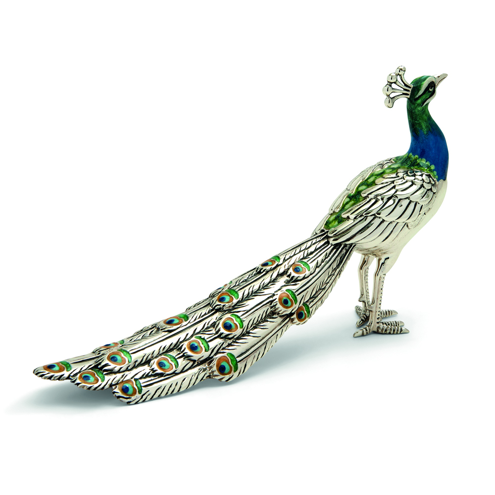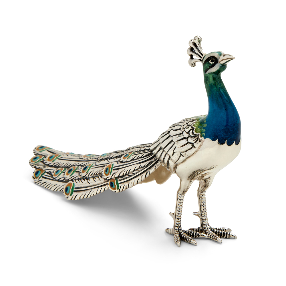 The majestic silver and enamel Peacock would create a beautiful centrepiece in any dining room. Featuring enamelled blue-green plumage and spotted tail feathers, the artisans of Saturno have created a truly eye catching ornament. Every piece has been lacquered to prevent the silver from tarnishing, and is presented in a luxurious gift box. The peacock carries a UK hallmark, which is your guarantee that the item has been made in .925 sterling silver. A regular clean with a soft cloth will keep the item in great condition.