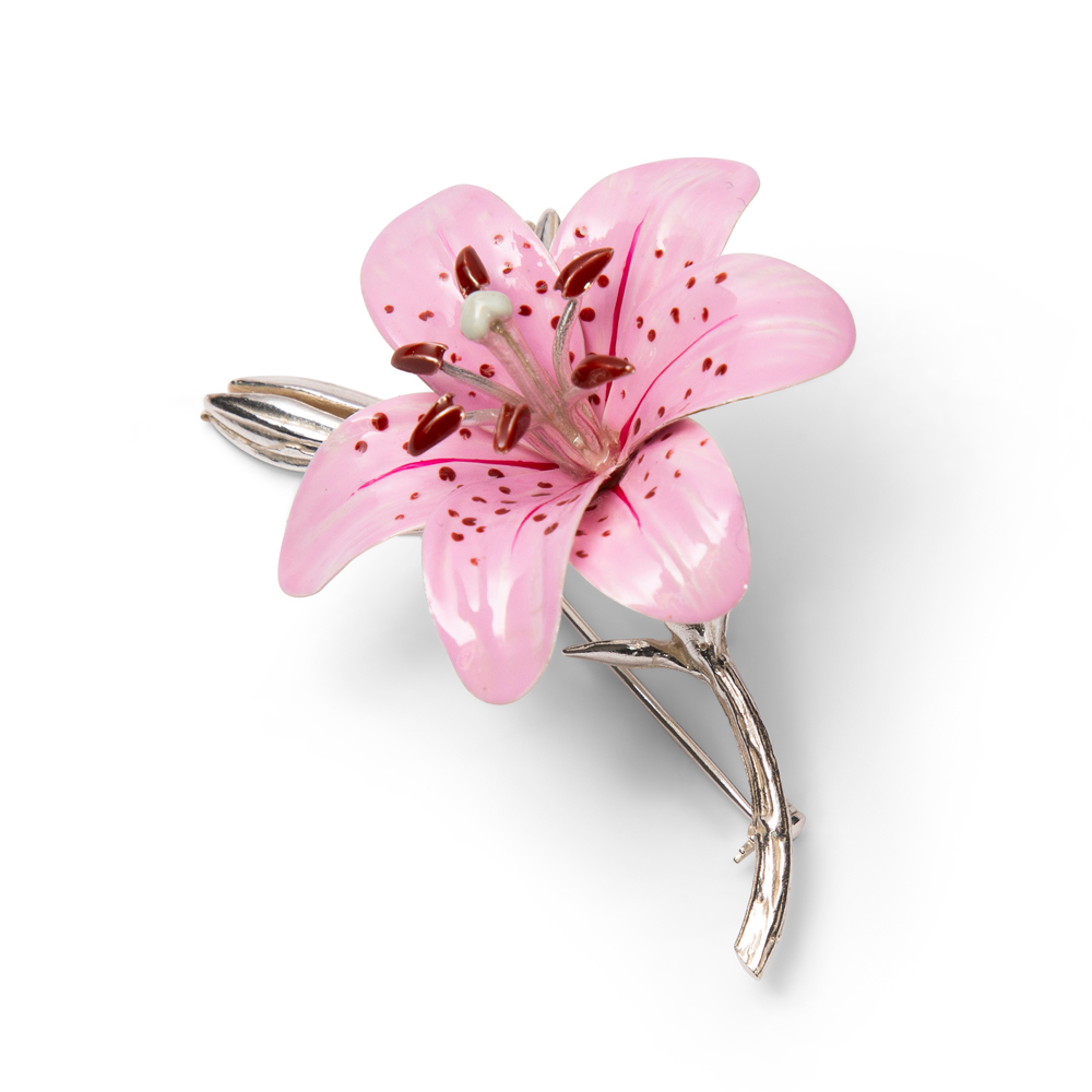 Inspired by the delicate beauty of nature, this handmade pink lily brooch by Saturno is a vibrant celebration of colour and craftsmanship. Meticulously crafted in sterling silver and finished with layers of luminous, hand-applied enamel, it’s a striking accessory that captures attention and admiration.
