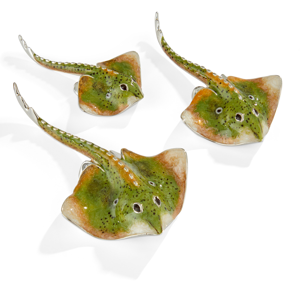 Our green ray fish perfectly capture this stingray, featuring a flat body, pectoral fins fused to their head, and whip-like tails. The silver and enamel ornaments are highly collectible and make for truly unique gifts.