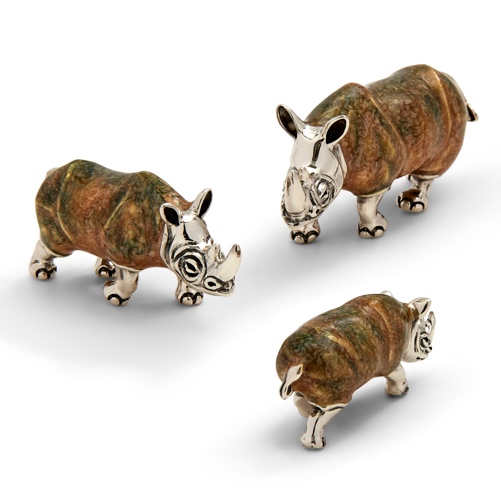 A beautiful rhinoceros family, made in sterling silver with enamel detailing. The perfect gift for those who have seen these amazing animals in their natural habitat, and wish to preserve the memory. Available to purchase individually, each rhino is lacquered to prevent the silver from tarnishing, and is supplied in one of our signature gift boxes. For maintenance purposes, clean using a soft cloth only.