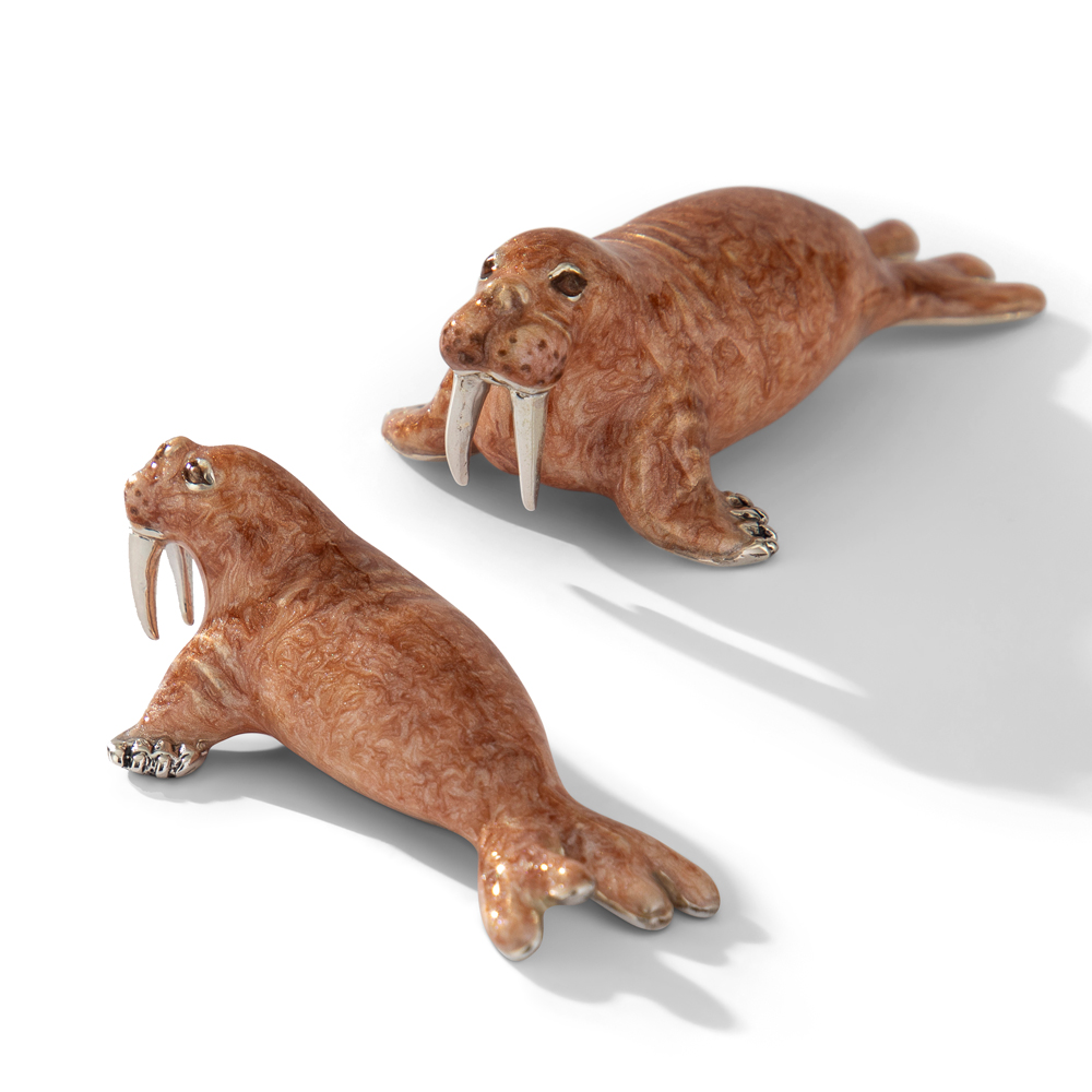 A beautiful walrus couple, made in sterling silver with cinnamon brown enamelled detailing throughout. These ornaments are made in Italy by Saturno SRL, in their factory in Tuscany. Available to purchase individually, each piece carries UK hallmarks and is supplied in a luxurious box. The ornaments are lacquered to prevent the silver from tarnishing, and therefore require minimal cleaning. For maintenance purposes, dust occasionally with a soft cloth.